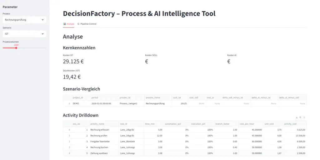 Kostentreiber identifizieren, Szenarien vergleichen, Automatisierungspotenziale aufdecken und Governance-Impacts bewerten.
